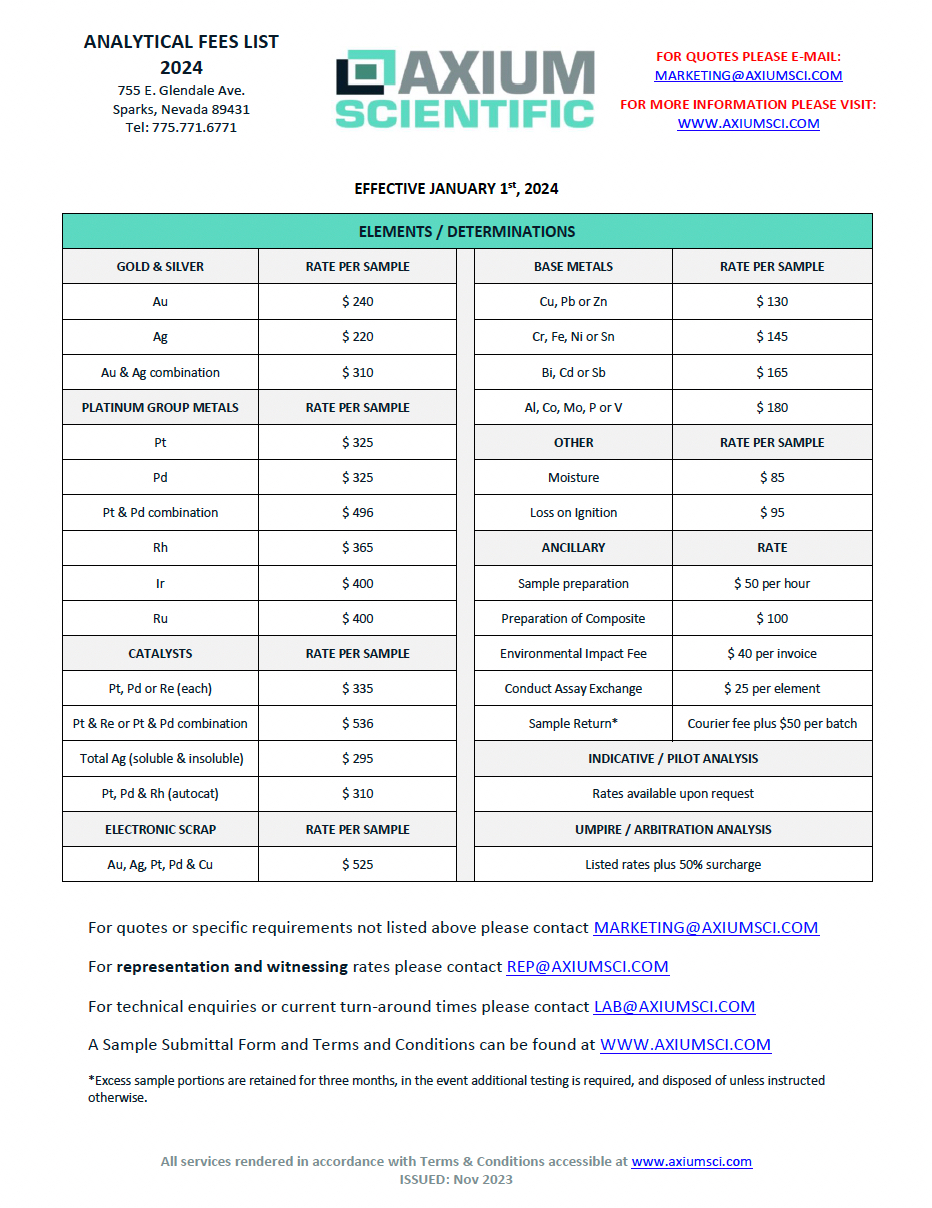 Axium Scientific is a full-service lab based in Sparks, NV and formed in 2016. The custom-designed laboratory is a newly-built, fully equipped, state of the art facility incorporating industry standard methodology and the latest technology. The management, chemists and lab technicians of Axium possess over one hundred years of combined experience in this highly specialized industry, and senior management is actively involved in the International Precious Metals Institute and its Sampling Analytical Council.